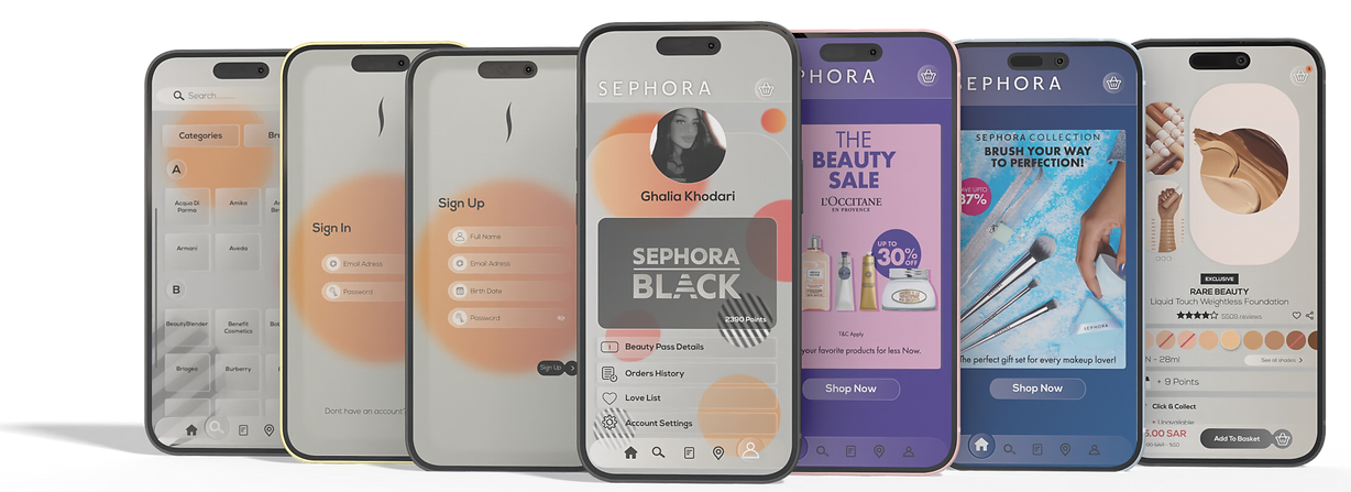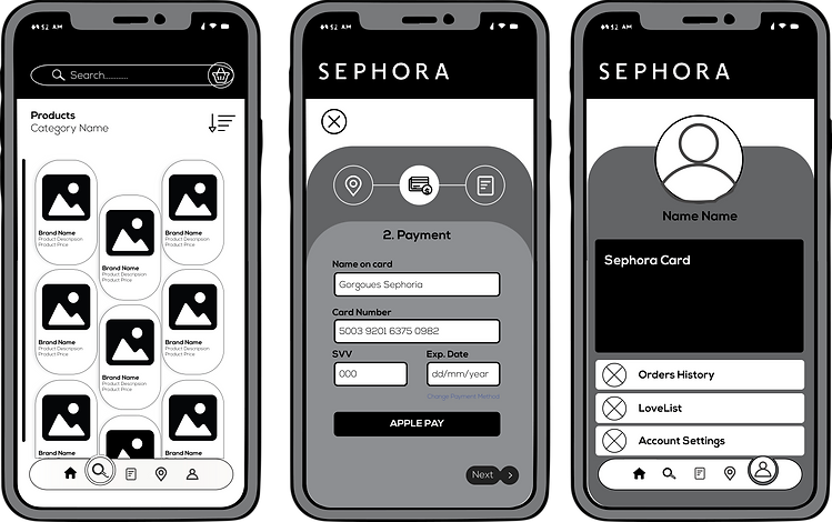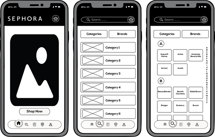 The current Sephora app is functional but outdated, with a basic black-and-white design that feels monotonous and lacks modern, dynamic features. It fails to reflect Sephora's bold, fun, and expressive brand identity, resulting in a less engaging and uninspiring user experience.
